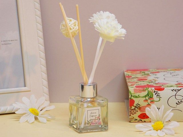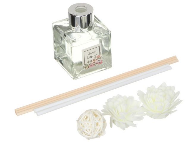 Флакон имеет современный и элегантный дизайн с декором в виде нежного цветка, что делает его прекрасным дополнением к любому интерьеру. Набор включает палочки, которые помогают равномерно распределять аромат по всему помещению. Вы можете регулировать интенсивность аромата, добавляя или убирая палочки.
