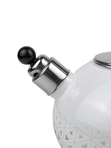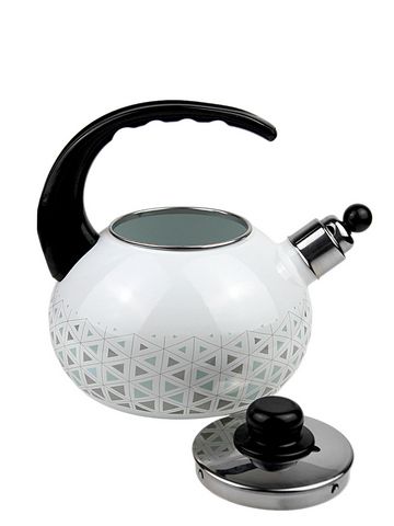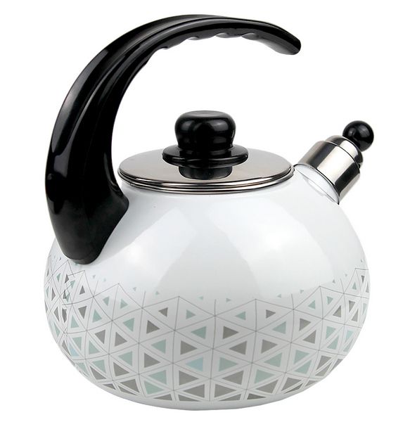 Материал чайник и крышки: высококачественная сталь покрытая эмалью. Общий объем: 2,5 л. Высота с ручкой: 21,5 см. Диаметр: 19 см. Цвет чайника: белый с рисунком "треугольники". Тип ручки: фиксированная. Материал ручки: бакелит. Цвет ручки: черный.