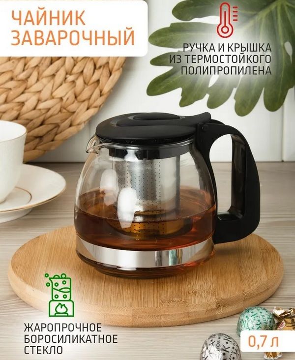 Читать все статьиЧайник заварочный 700мл стеклянный, нержавеющая сталь, пластик, черный