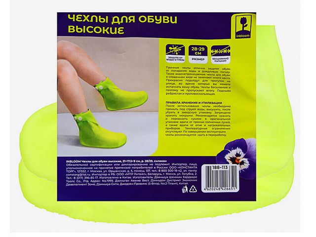 Чехлы для обуви INBLOOM высокие 21х17,5х9 см, размер 28/29 см изготовлены из бесшовного силикона и обеспечивают надежную и длительную защиту обуви от попадания влаги и грязи во время прогулок в дождливую погоду и работы на приусадебном участке. Легко моются и не занимают много места. Плотный материал не рвется. Ребристая подошва устойчива к скольжению.