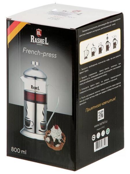 RasheL Кофейник (френч-пресс) 800мл. Изготовлен из высококачественного термостойкого стекла и нержавеющей стали. Преимущества термостойкого стекла в том, что чайник из него получается легким, термостойким, не впитывает запахов, а также не тускнеет даже по прошествии времени.