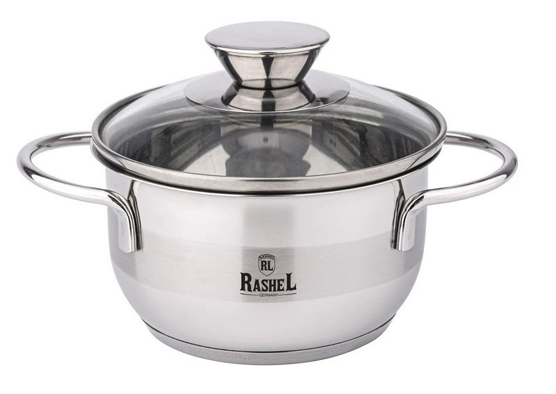 Rashel Мини Кастрюля 1,2л из нержавеющей стали, крышка диаметром 14см из стекла с отверстием для паровыпуска, индукционное дно.