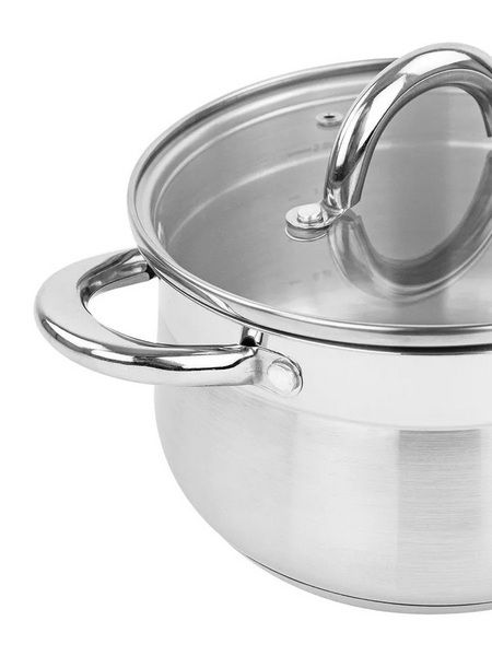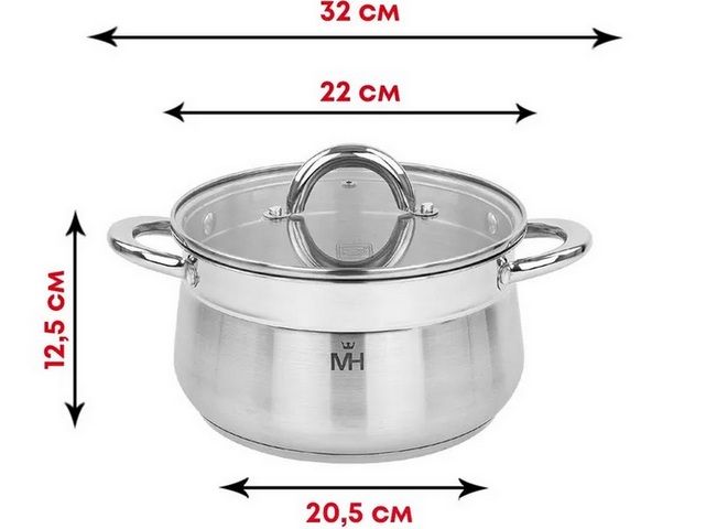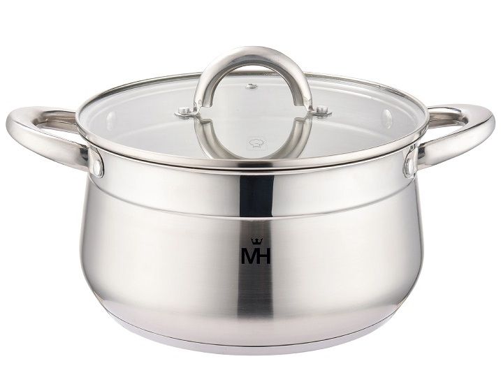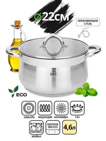 MercuryHaus Skirt Кастрюля 4,6л из нержавеющей стали, крышка диаметром 22см из стекла с отверстием для паровыпуска, индукционное дно.