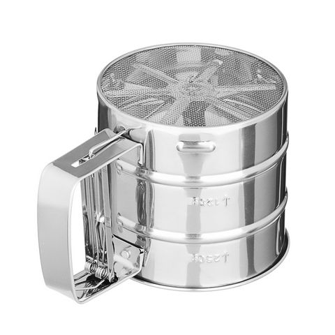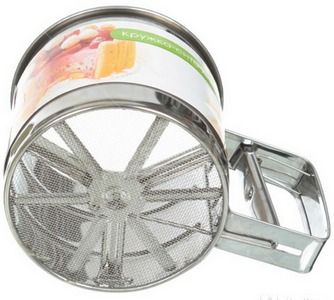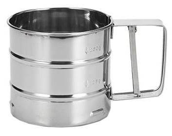 Кружка-сито - ёмкость для просеивания муки, сахарной пудры, манки, какао и других мелких сыпучих продуктов. Кружка состоит из корпуса с ситовым дном и ручки, внутри которой находится пружина. Благодаря ручке-рычагу вы с легкостью просеете муку, без труда потом очистите изделие от остатков.