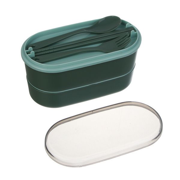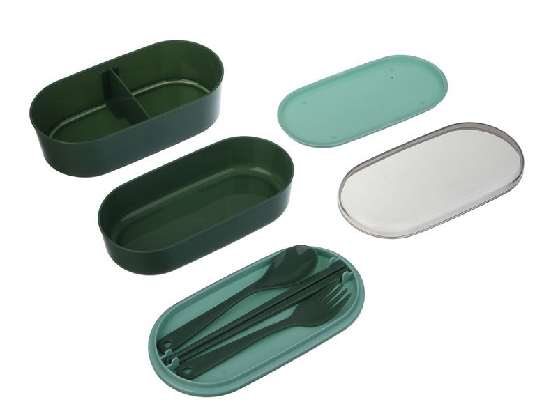 Комплект включает: два контейнера: один с разделителем (для разных продуктов), второй — большой, универсальный; прозрачную крышку с герметичным замком — надёжно сохраняет свежесть и предотвращает проливание; пластиковую посуду (ложка, вилка) — компактно хранится в отсеке крышки. Ремень для фиксации удерживает бокс в собранном виде, не даёт раскрыться в сумке. Компактный размер, лёгкий вес и эргономичная форма делают этот ланч-бокс идеальным спутником на работу, в школу, на природу или в путешествие.