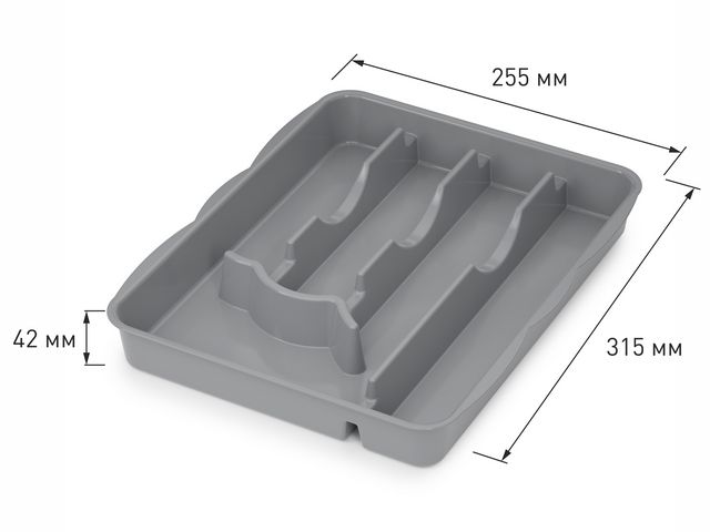 Лоток для столовых приборов изготовлен из прочного и высококачественного пластика. В такой лоток поместится большое количество столовых приборов, при этом они будут упорядочены. Изделие легко достать и помыть в случае необходимости.Лоток имеет пять отделений: три отделения для вилок, ложек, одно горизонтальное для чайных ложек и десертных вилок, одно большое отделение для ножей и остальных приборов.