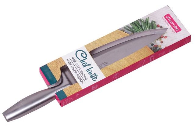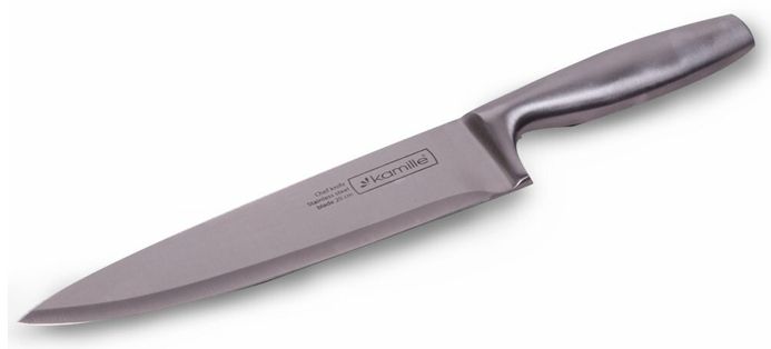Kamille Тип ножа: "Шеф-повар". Материал лезвия: нержавеющая сталь. Длина лезвия: 20см. Заточка лезвия: односторонняя. Материал рукоятки: нержавеющая сталь. Длина рукоятки: 13см. Тип рукоятки: полая. Чехол: нет. Подходит для мытья в посудомоечной машине: нет.