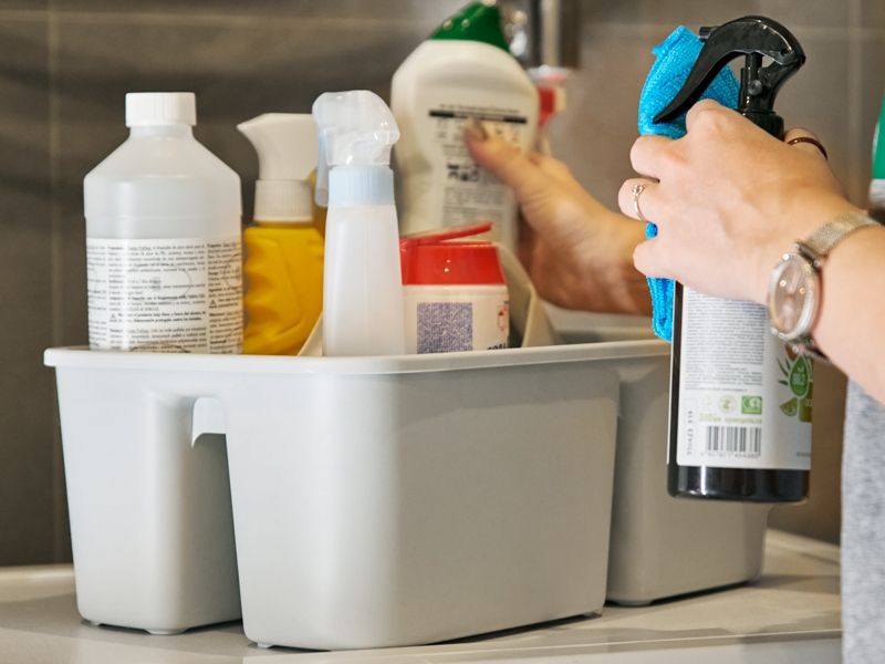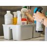Моющие средства для дома удобно хранить в одной переноске. Она вместительная: длина 40 см, а ширина 26 см. Это больше остальных переносок на 2-3 см. В переноску поместится всё, что нужно для генеральной уборки: дезинфицирующее средство, очиститель для стёкол, средство для мытья полов, тряпки, губки и мусорные мешки.