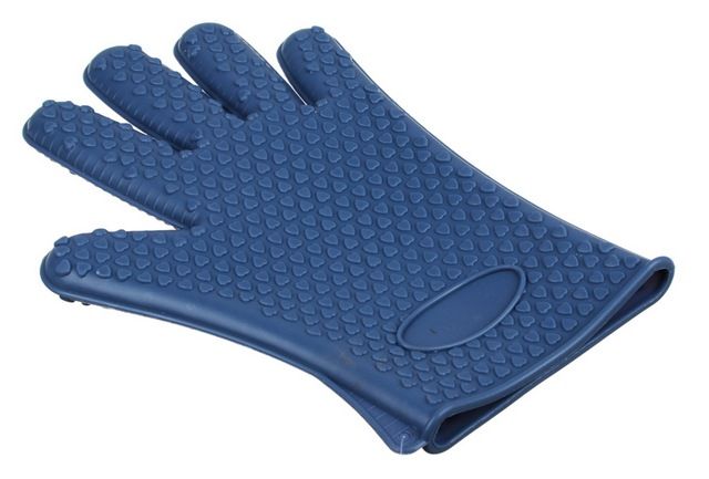 Прихватка в форме перчатки из силикона с рифленой поверхностью, препятствующей скольжению.