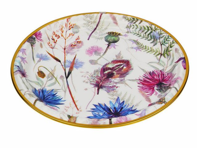 Диаметр 27,5 см и высота 2 см делают его универсальным для сервировки, а изящный цветочный рисунок с золотым ободком добавляет утонченности. Изготовленный из прочного полипропилена, он легко моется и устойчив к повреждениям. Поднос можно использовать не только для подачи, но и в качестве подставки для свечей или основы для дизайнерских композиций.