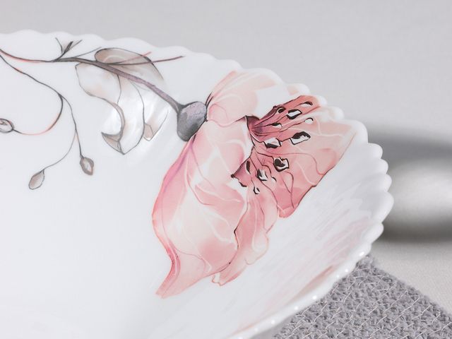 Millimi Роселла Салатник диаметром 16,5см, опаловое стекло. Опаловое стекло (ударопрочность), не боится царапин от вилок, ножей, пригодно для микроволновых печей и мытья в посудомоечных машинах, жаропрочность до 125˚C.