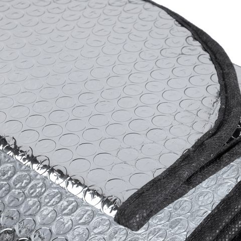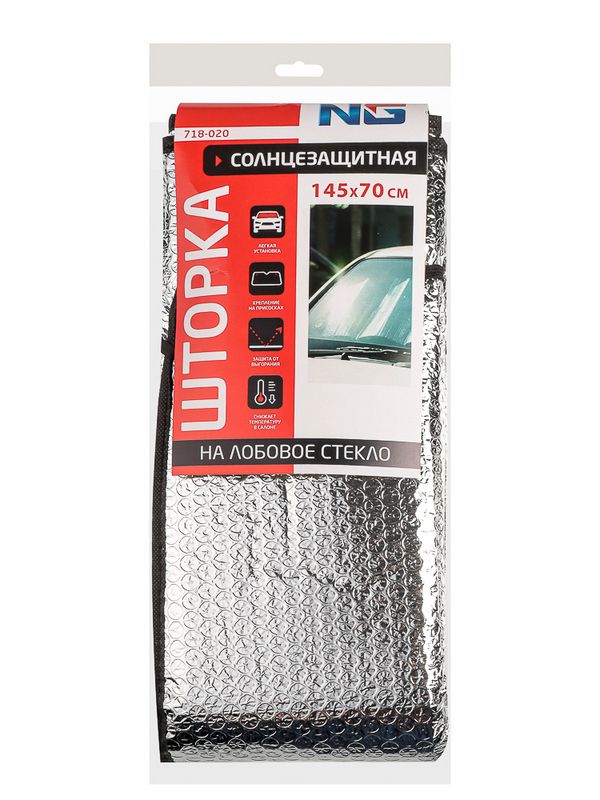 Двусторонняя солнцезащитная шторка размером 145x70 см защитит от попадания солнечных лучей со стороны лобового стекла в салон машины. Серебристая поверхность шторки отражает солнечные лучи, предотвращает их попадание в салон и защищает торпеду автомобиля от нагрева.