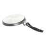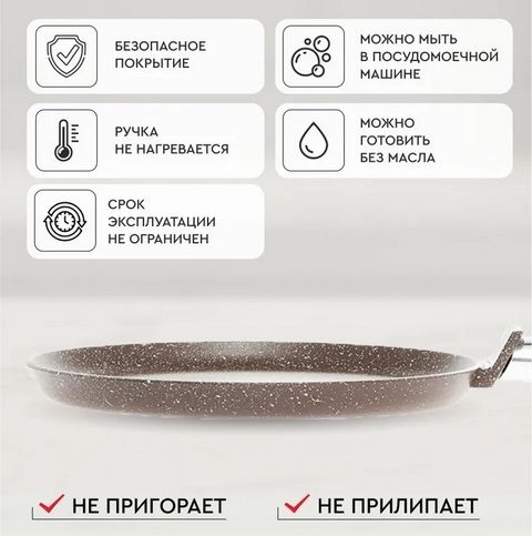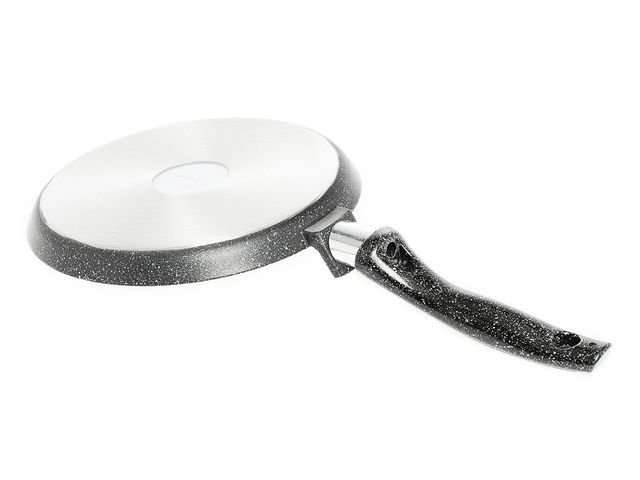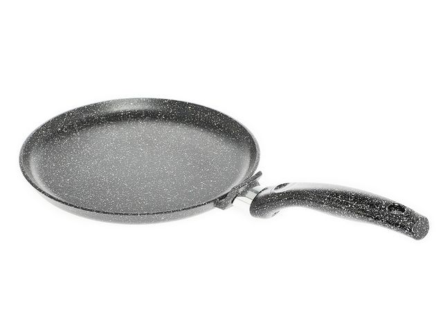 Сковорода блинная: литая алюминиевая с пластиковой несьемной ручкой, утолщенным дном и антипригарным покрытием.