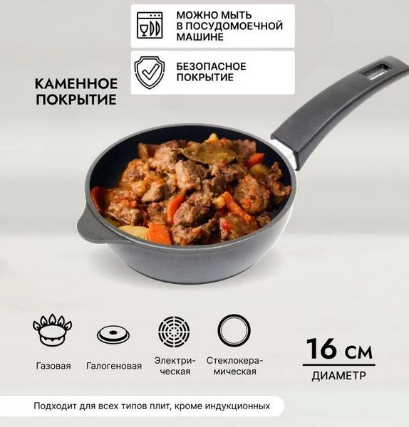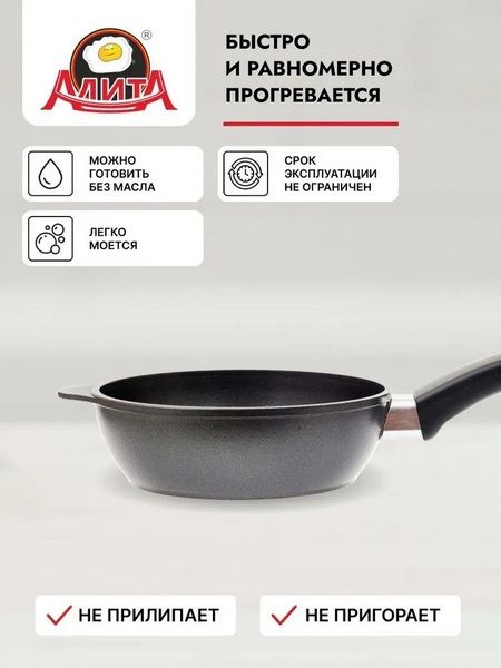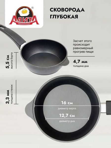 АЛИТА Сковорода "Уля" диаметром 16см с ручкой (литой алюминий, толщина дна 5мм, антипригарное покрытие, цвет: черный) РОССИЯ