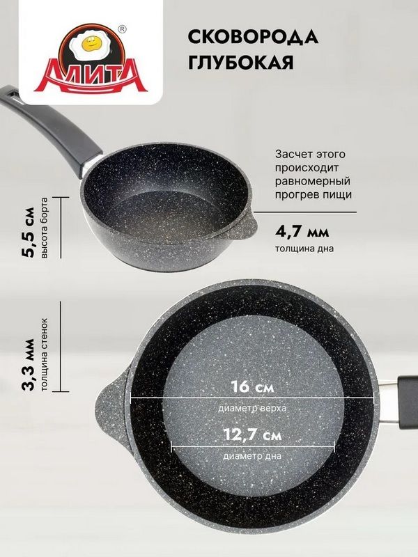 Читать все статьиСковорода «Уля» диаметром 16см, литой алюминий, каменное покрытие. РОССИЯ