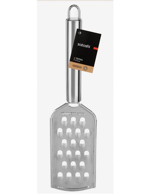 Терка ручная SATOSHI размером 24,5х5,8см предназначена для крупной шинковки овощей, фруктов, сыров и других продуктов. Изготовлена из нержавеющей стали, имеет удобную ручку и компактный размер, поэтому при помощи нее можно натирать продукты прямо в тарелку. Изделие не подвержено коррозии и деформации. Легко моется вручную или в посудомоечной машине. Предусмотрено металлическое ушко для хранения на крючке.