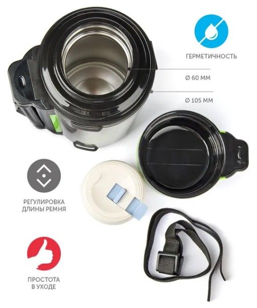 5. Термос имеет комфортную боковую ручку и ремень для удобства переноски в комплекте