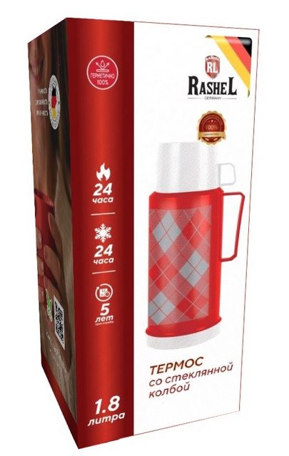 Rashel Термос со стеклянной колбой 1,8л, цвет: красный/белый.